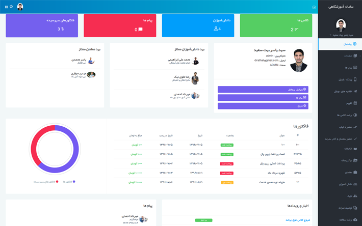 مدیریت دانش آموزان و معلمان سیستم جامع حسابداری سیستم جامع پیامکی اعلام نمرات امتحانی و انضباطی آزمون آنلاین حضور و غیاب تکالیف کلاسی سرویس مدرسه و ......